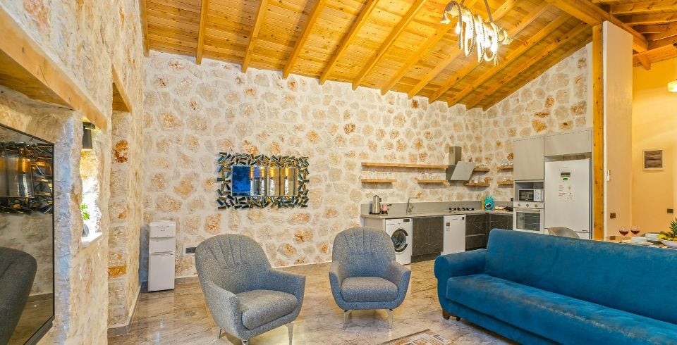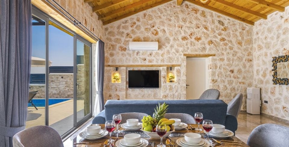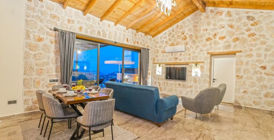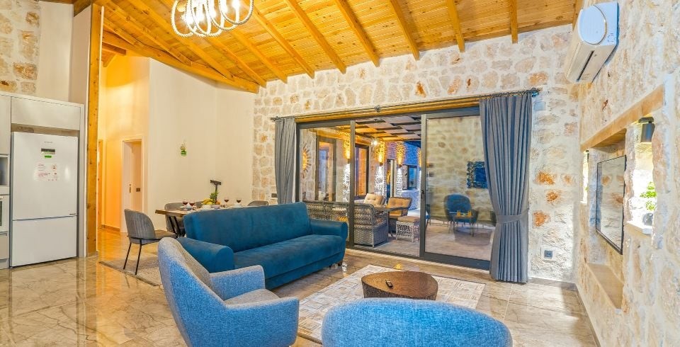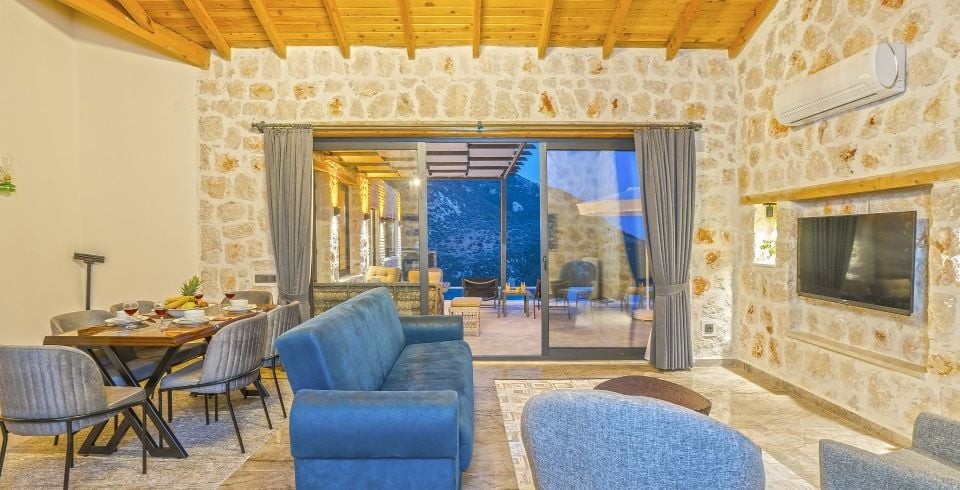 Salon: Villa salonunda konforlu oturma grubu, klima, TV, internet, uydu alıcı, yemek masası, sehpa bulunmaktadır.