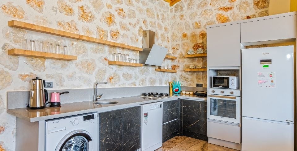 Mutfak: Villamızın mutfağında buzdolabı bulaşık makinası, çamaşır makinası, 4'lü ocak, ketıl, mikro dalga fırın, filtre kahve makinası 4 kişilik yemek takımı bulunmaktadır.