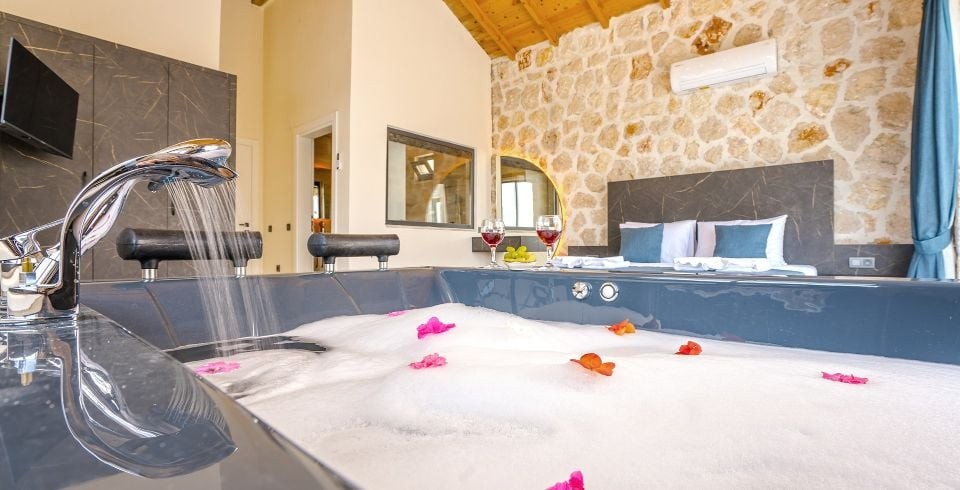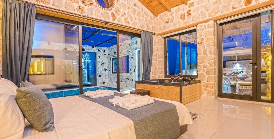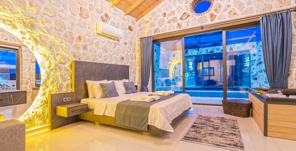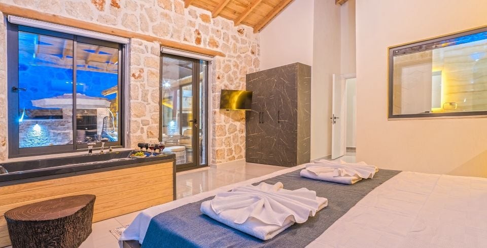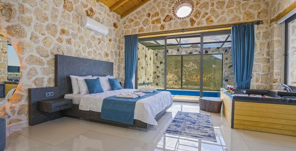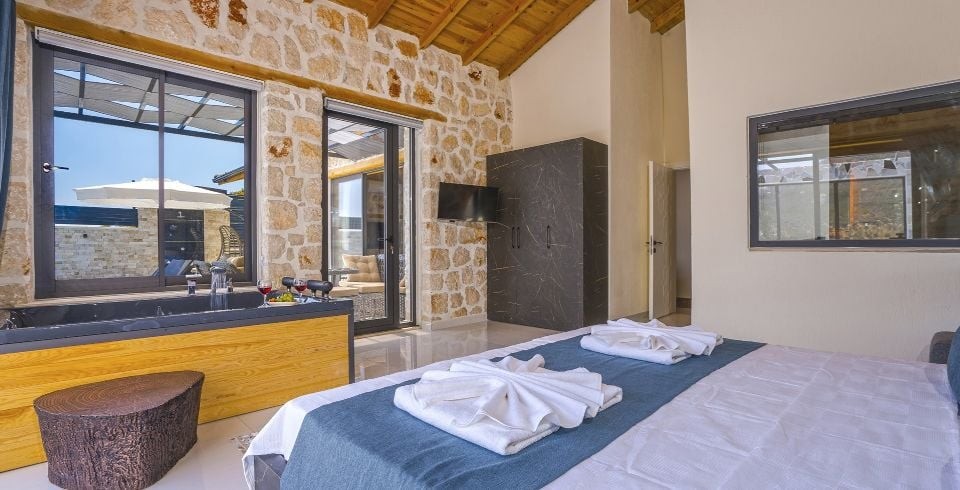 1. Yatak Odası: Çift kişilik yatak, klima, jakuzi, komodin, elbise dolabı, makyaj masası, banyo ve tuvalet bulunmaktadır.