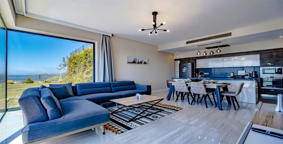 Salon : Salon içerisinde oturma grubu, TV, klima ve sehpa bulunmaktadır. Havuz terasına çıkış sağlanabilir.