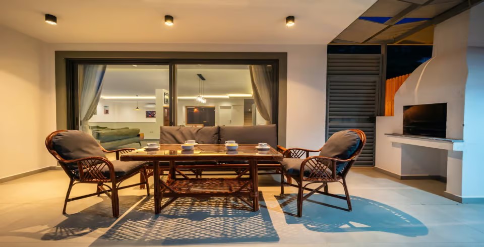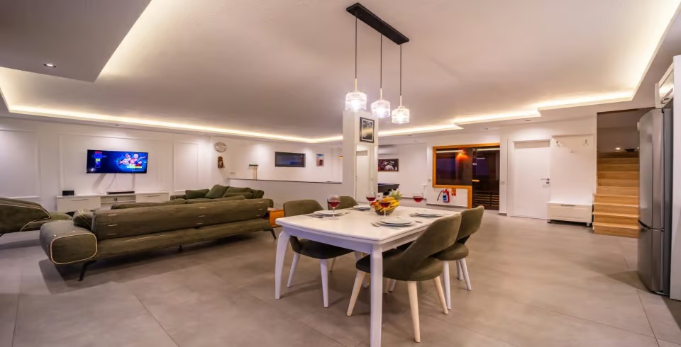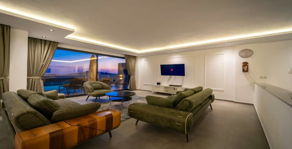 Salon : Villa Kaya Royal’in salonunda sizi şık bir oturma grubu ile klima, televizyon, internet, uydu, koltuk, sehpa ile ferah bir salon bekliyor olacaktır. Havuz terasına çıkış yapılmaktadır.