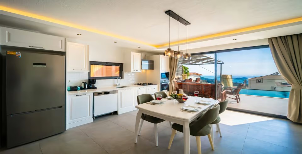 Mutfak : Villamızın geniş Amerikan mutfağı ile sizlere kendi evinizin mutfağı gibi hissettirecek. Ayrıca mutfakta klima, bulaşık makinası, buzdolabı, çamaşır makinası, mikrodalga fırın, tost makinası, ekmek kızartma, su ısıtıcısı, fırın, 4`lü ocak seti ve 6 kişilik geniş yemek masası ile tava tencere vb. mutfak araç gereçlerini kullanma fırsatını sizlere sunuyoruz.