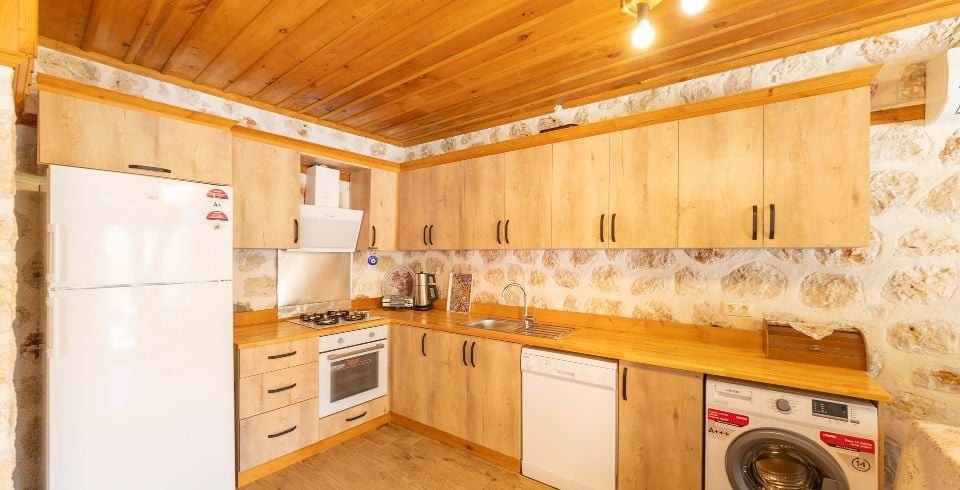 Mutfak: Villamızın mutfağında buzdolabı bulaşık makinası, çamaşır makinası, 4'lü ocak, ketıl, mikro dalga fırın, filtre kahve makinası 4 kişilik yemek takımı bulunmaktadır.