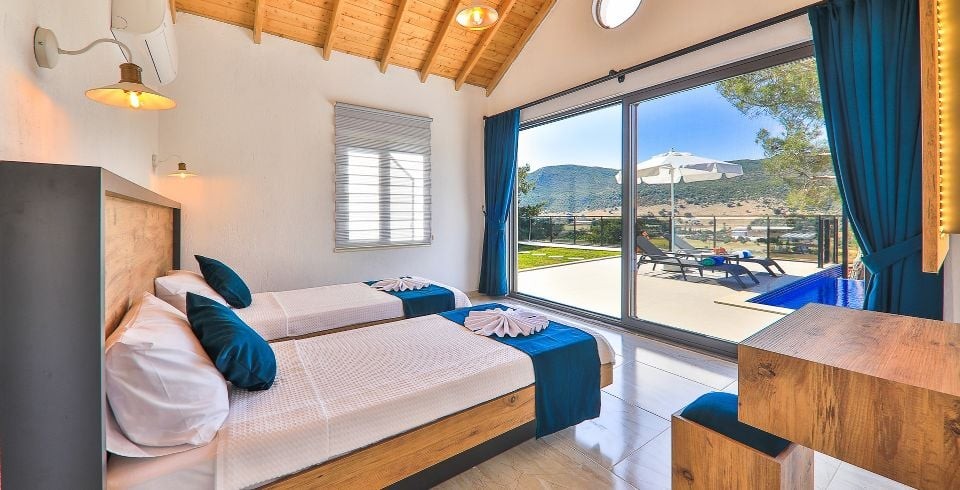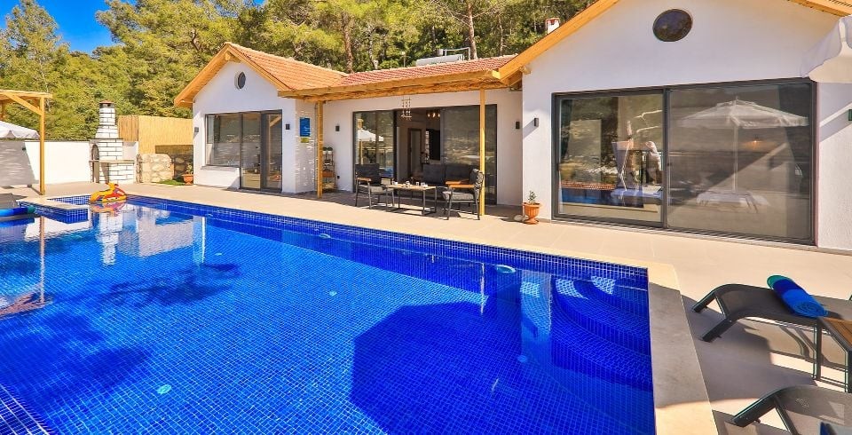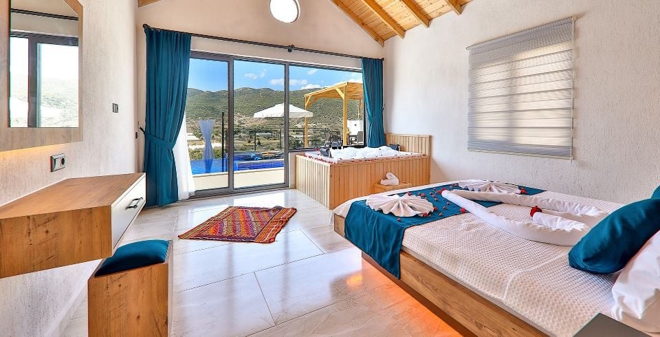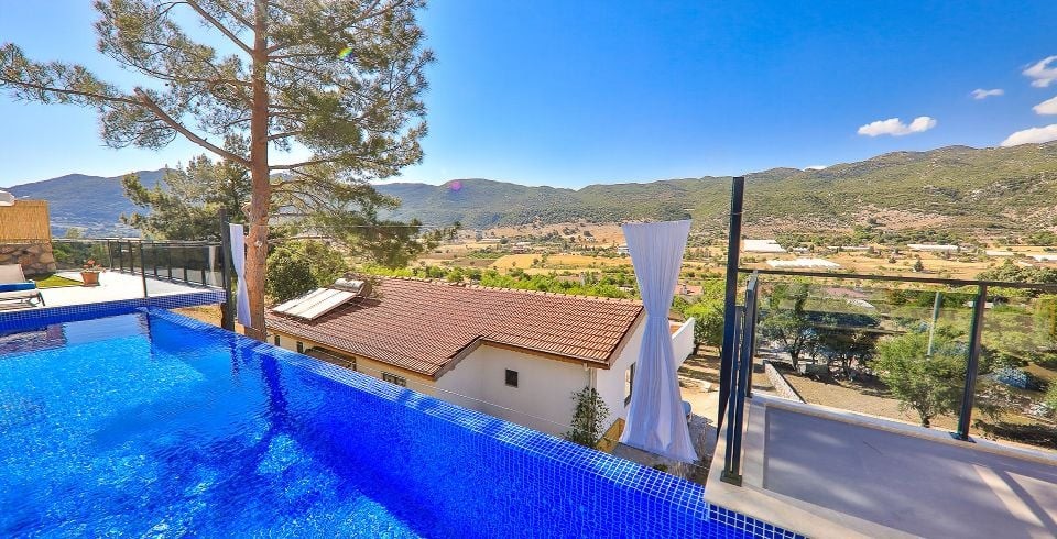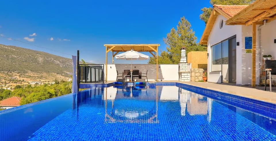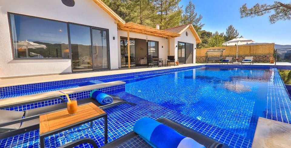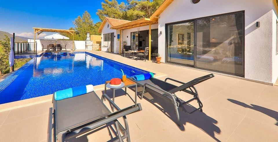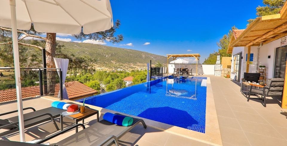 Kalkan Sarıbelen bölgesinde doğa  manzarasına sahip 2 Yatak Odalı 4 Kişilik Özel Yüzme Havuzlu Muhafazakar Kiralık villamız 2021 yılında tamamlanmış olup yeni ve modern bir villamızdır. Balayı çiftleri ve çocuklu aileler için geniş havuz terasında ve geniş bahçe alanında sessiz ve sakin rahat bir tatil arzulayan misafirlerimiz için bu villa seçeneğimiz son derece yerinde bir karar olacaktır.  Villamızın tüm yatak odalarından havuz terasına çıkış bulunmaktadır.