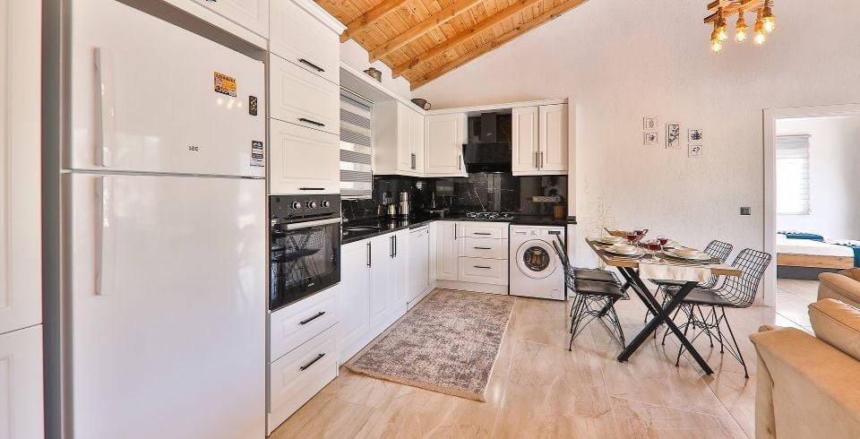 Mutfak : Modern Amerikan mutfak içerisinde 6 kişilik yemek masası , buzdolabı, bulaşık makinası, fırın, ocak, mikrodalga fırın, tost makinası, yemek masası, yemek takımları, çatal ve bıçak takımları, tencere ve tava takımları, bardaklar bulunmaktadır.