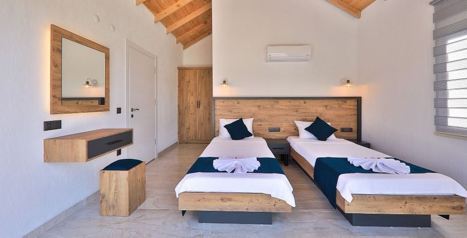 2. Yatak Odası : 2 adet tek kişilik yatak, klima, komodin, elbise dolabı, makyaj masası, banyo ve tuvalet bulunmaktadır.