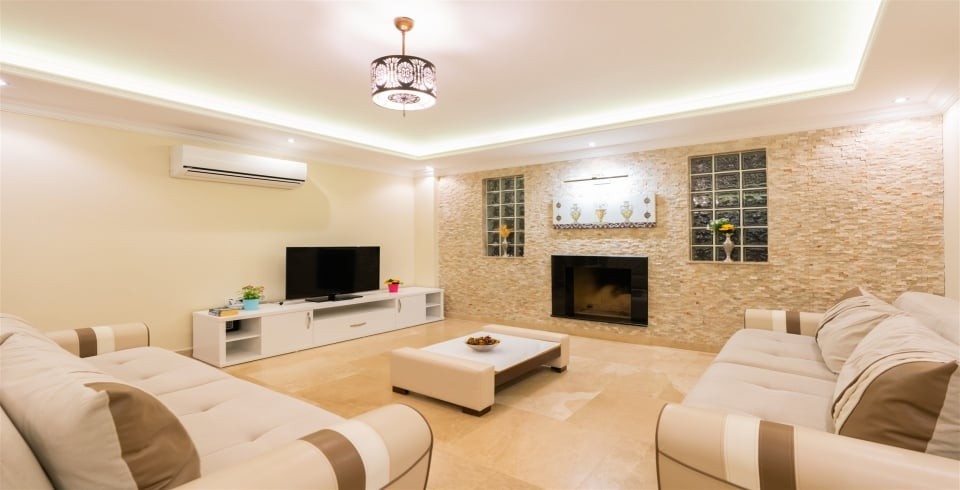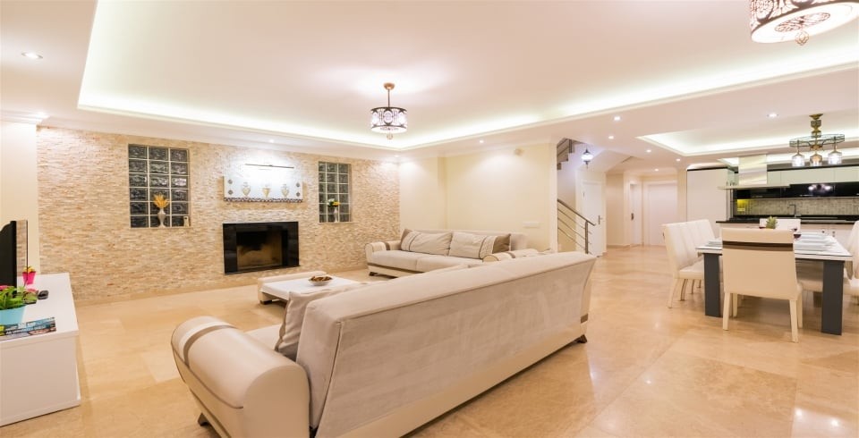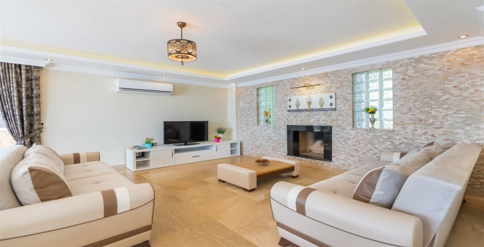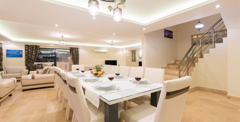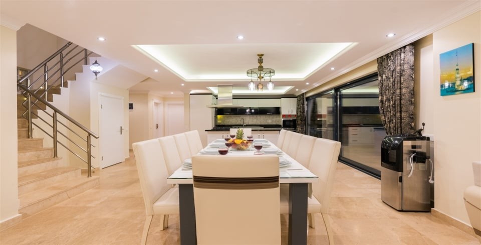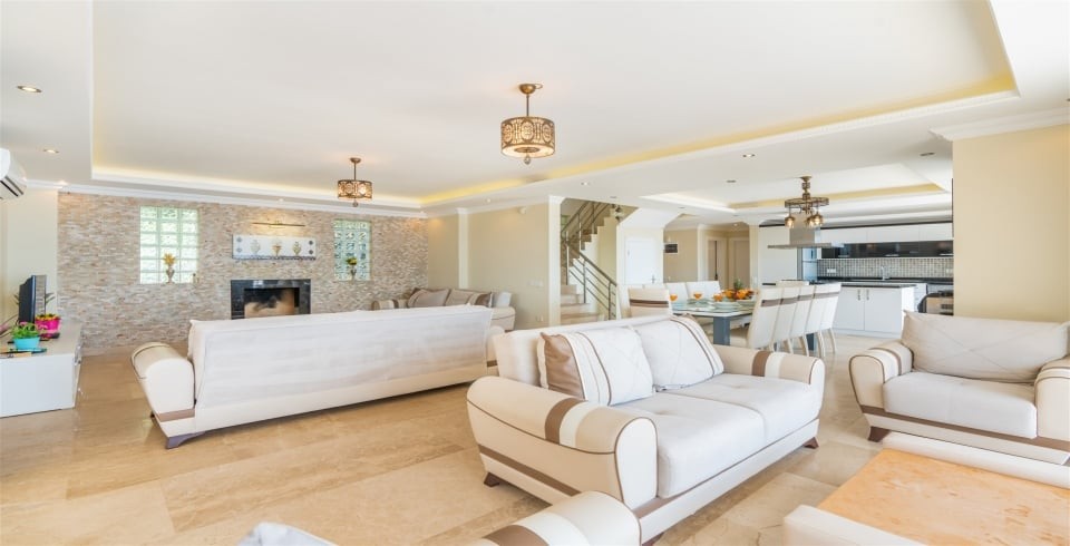 Salon : Salonumuz da sizi serinletmek için klima ile beraber LCD TV uydu alıcısı ve DVD'leriniz için DVD player bulunur. Özel ve şık bir oturma grubu aileniz için geniş bir yemek masası vardır. Şık bir şömineyle beraber ufak tefek işleriniz için sizi ütü derdinden kurtaracak bir ütü seti bulunur. Salonunuzda deniz manzarası olmasıyla birlikte havuz terasına çıkış yapabilme özelliği vardır. Salon havuz katında olduğu için çocuklarınız havuzda eğlenirken sizlerde onları rahatça gözetleyebilirsiniz.