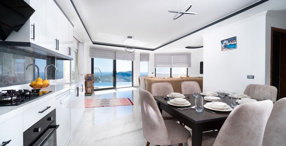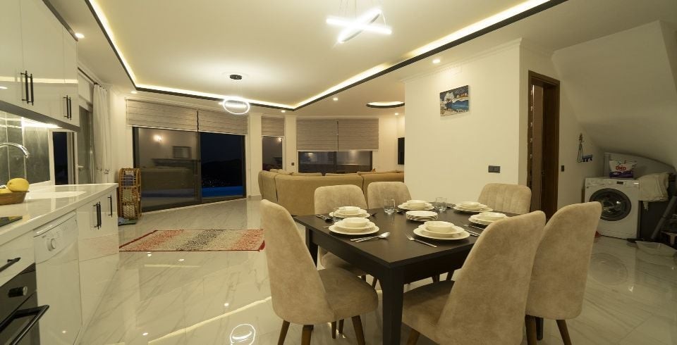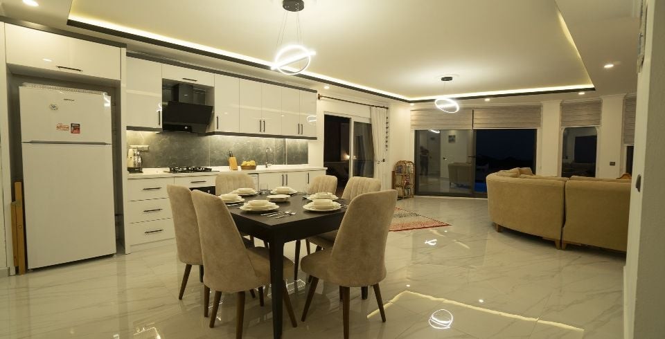 Mutfak : Mutfağımız şık bir modern Amerikan mutfaktır ve içerisinde ihtiyacınız olan her şey mevcuttur. Bunlar ankastre fırın, buzdolabı, bulaşık makinası, çamaşır makinası, sıcak içecekler için su ısıtıcısı, fırın, 4’lü ocak, tencere ve tavalar, yaklaşık 10 kişilik yemek takımı, çatal ve bıçak takımı, çay, kahve, su bardakları bulunmaktadır. Mutfağımız havuz katında bulunup havuz tarafına çok rahat geçiş yapılmaktadır.