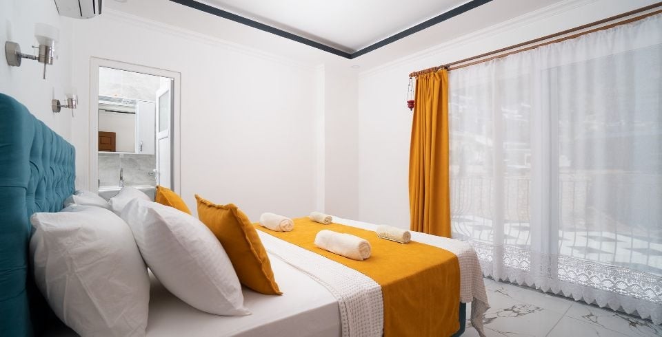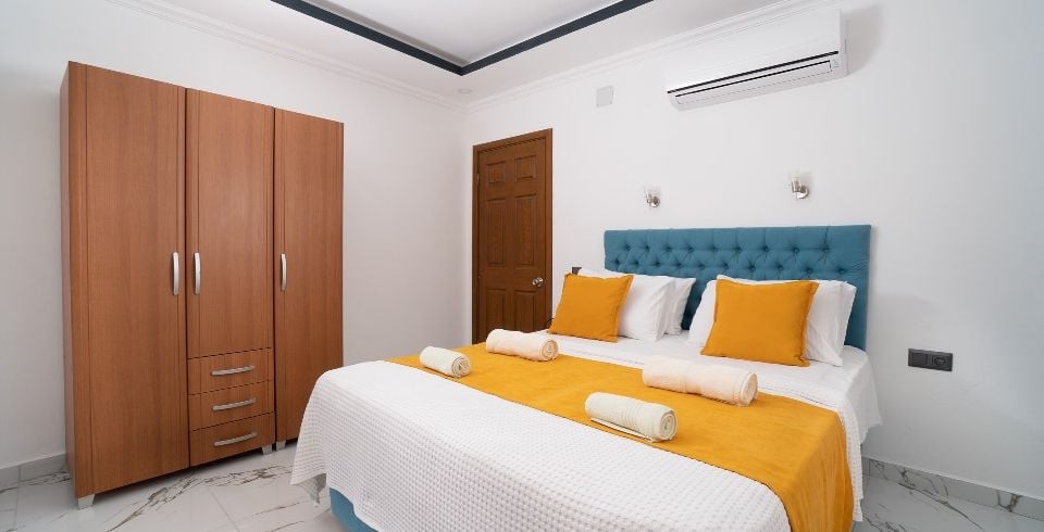 1. Yatak Odası : Çift kişilik yatak, klima, komodin, elbise dolabı, makyaj masası, banyo ve tuvalet bulunur.