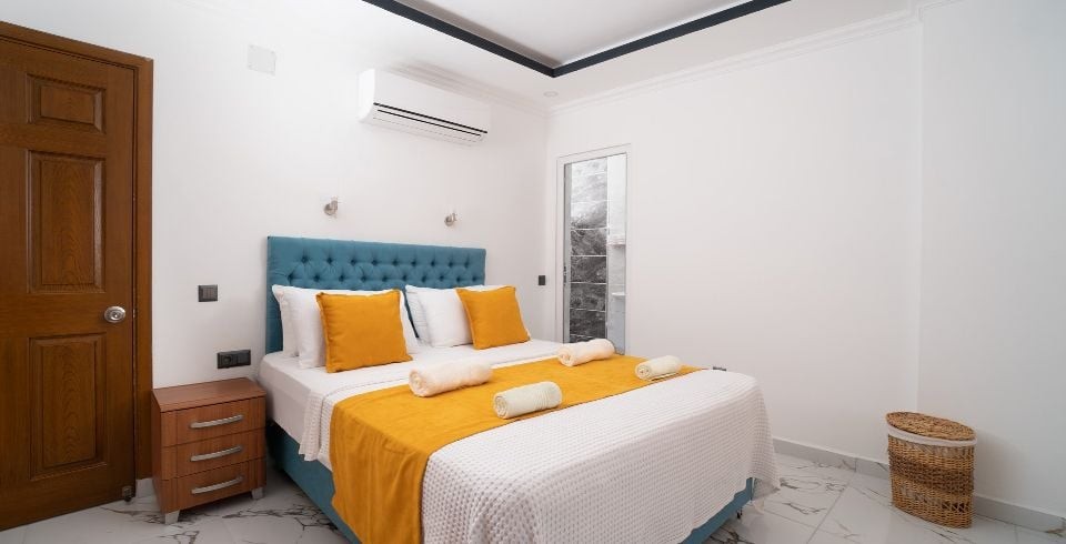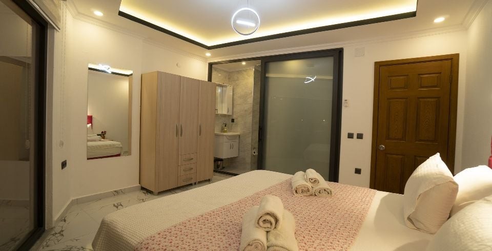 2. Yatak Odası : Çift kişilik yatak, klima, komodin, elbise dolabı, makyaj masası, banyo ve tuvalet bulunur.