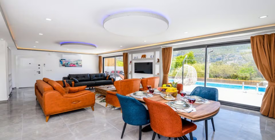 Salon: Villa salonunda konforlu oturma grubu, klima, TV, internet, uydu alıcı, yemek masası, sehpa bulunmaktadır.
