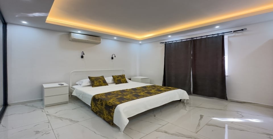 1. Yatak Odası :  1 Adet çift kişilik yatak , komodin , klima , makyaj masası , tv , elbise dolabı , jakuzi ve banyo & tuvalet bulunmaktadır.