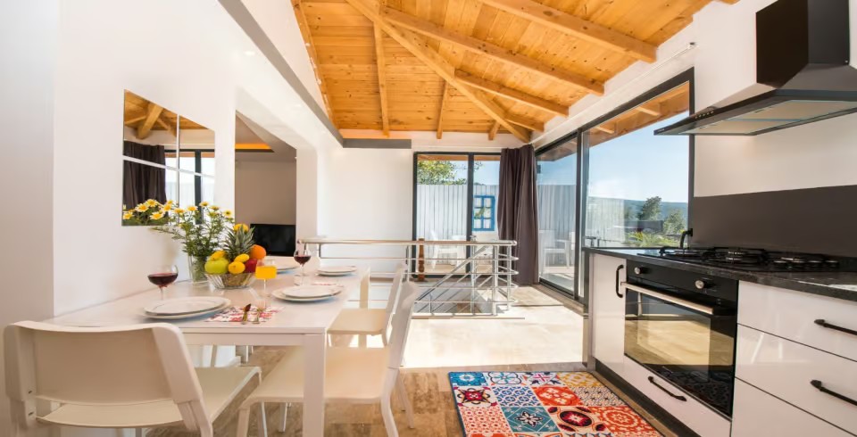 Mutfak: Açık planlı mutfak, 4 kişiye yetecek kadar mutfak malzemeleri, buzdolabı, fırın, ocak, mikrodalga fırın, bulaşık makinesi, çamaşır makinesi, tost makinesi, kettle ve çaydanlık bulunmaktadır..