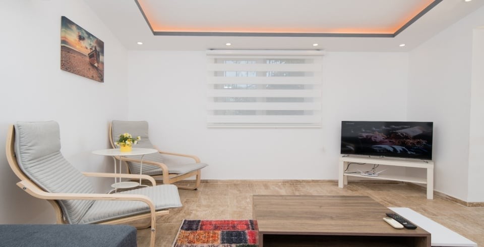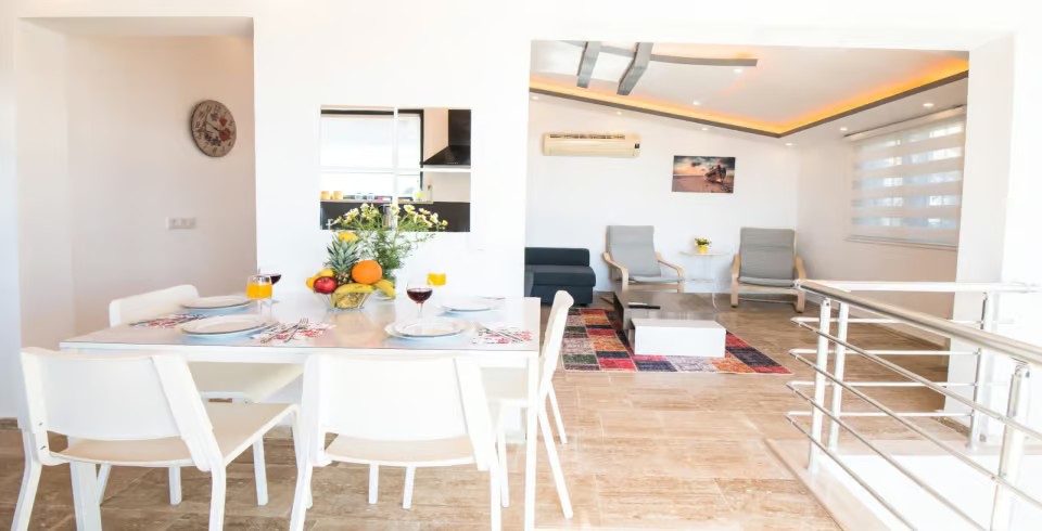 Salon: Özenle döşenmiş salon, modern koltuklar, 4 kişilik yemek masası, LCD TV ve klima bulunmaktadır.