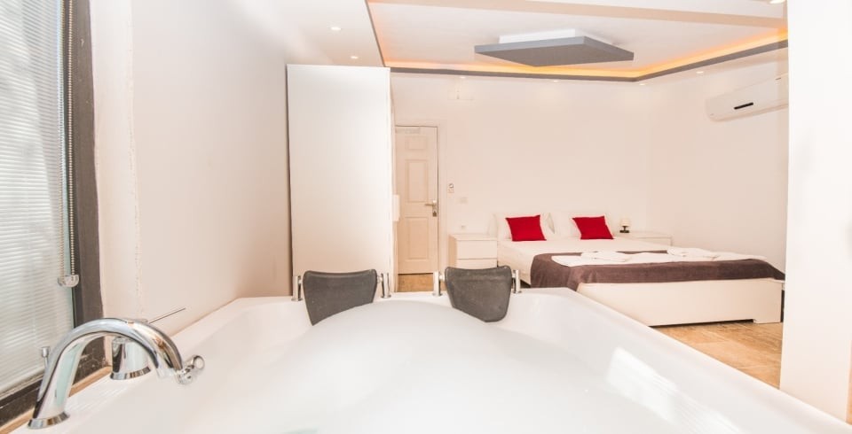 1.Yatak Odası: 1 adet çift kişilik yatak, elbise dolabı, komodin, klima, jakuzi, banyo ve lavabo bulunmaktadır.