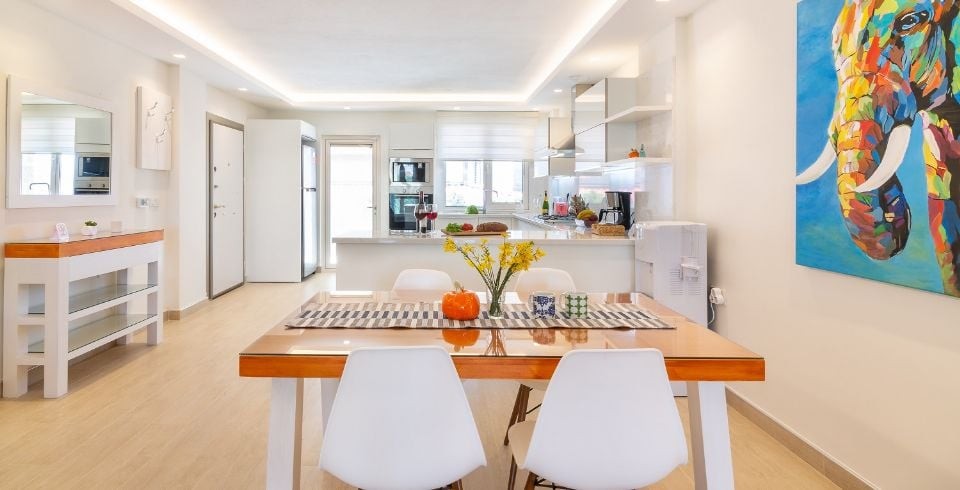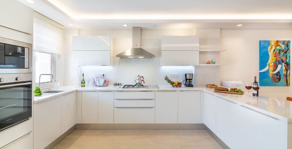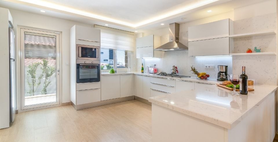 Mutfak : Modern Amerikan mutfakta buz dolabı, bulaşık makinası, 4'lü ocak, fırın, mikrodalga fırın, ekmek kızartma makinası, ketil, 2 kişilik yemek masası, yemek takımları, çatal ve bıçak takımları, tencere ve tava takımları, bardaklar bulunmaktadır.