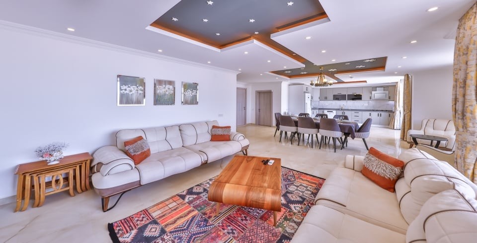 Salon: Özenle döşenmiş salon, modern koltuklar, 6 kişilik yemek masası, LCD TV ve klima bulunmaktadır.