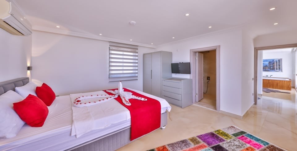 1.Yatak Odası: 1 adet çift kişilik yatak, elbise dolabı, komodin, klima, jakuzi, makyaj masası, banyo ve lavabo bulunmaktadır.