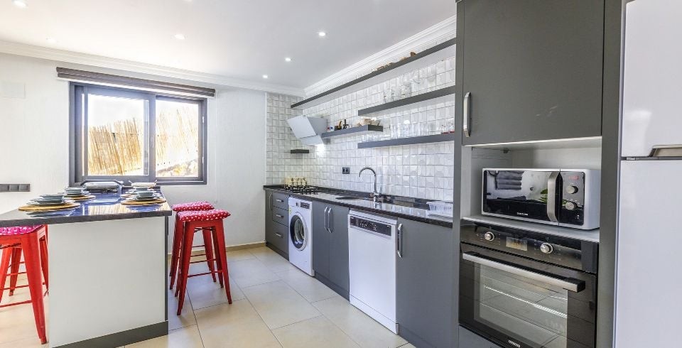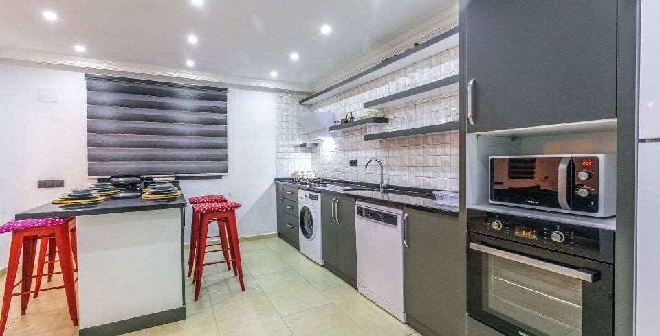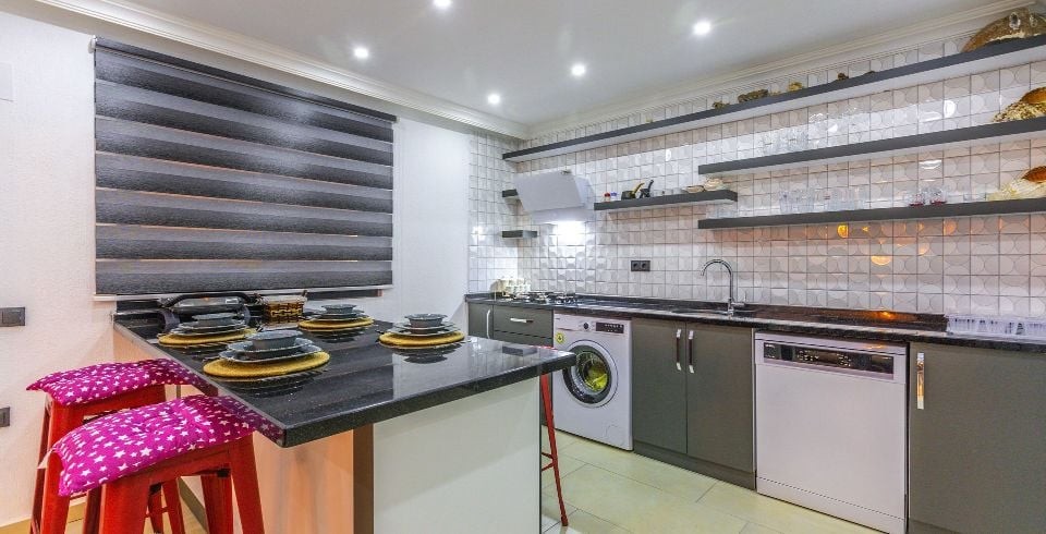 Mutfak : Modern Amerikan mutfağında; buzdolabı, bulaşık makinesi, çamaşır makinesi, fırın, mikrodalga, tost makinesi, elektrikli su ısıtıcısı, 4’lü ocak, kişilik yemek takımı, tava, tencereler, çatal, bıçak takımları bulunmaktadır.