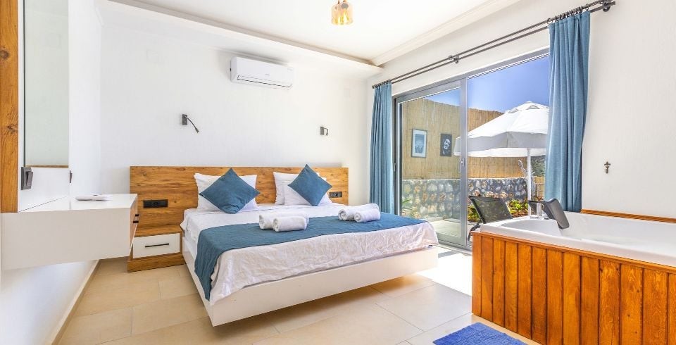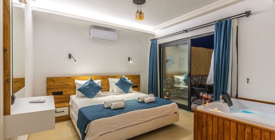 1. Yatak Odası : Bir adet çift kişilik yatak, elbise dolabı, komodin, makyaj masası, klima, jakuzi, banyo ve tuvalet bulunmaktadır.
