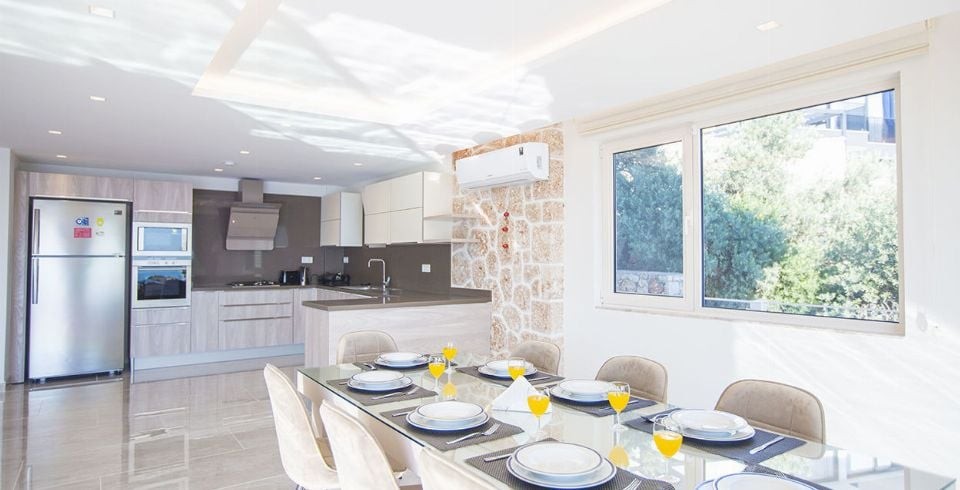 Mutfak : Villamızın geniş Amerikan mutfağı ile sizlere kendi evinizin mutfağı gibi hissettirecek. Ayrıca mutfakta klima, bulaşık makinası, buzdolabı, çamaşır makinası, mikrodalga fırın, tost makinası, ekmek kızartma, su ısıtıcısı, fırın, 4`lü ocak ankastre seti ve 8 kişilik geniş yemek masası ile tava tencere vb. mutfak araç gereçleri bulunmaktadır.