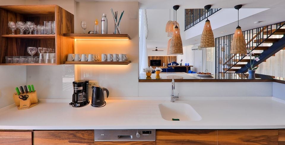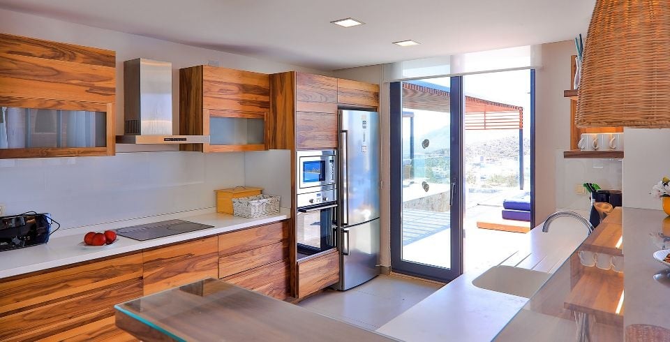Mutfak : Villa Elmas içinde modern Amerikan mutfak bulunmaktadır. Mutfakta mikrodalga fırın, bulaşık makinası, ankastre fırın, buzdolabı, çamaşır makinası, ankastre 4’lü ocak, elektrikli su ısıtıcı kettle, ekmek kızartma makinası, tencere ve tava takımı, 10 kişilik yemek takımı, kaşık ve çatal seti ve bardaklar bulunmaktadır. Havuz başına geçiş bulunmaktadır.