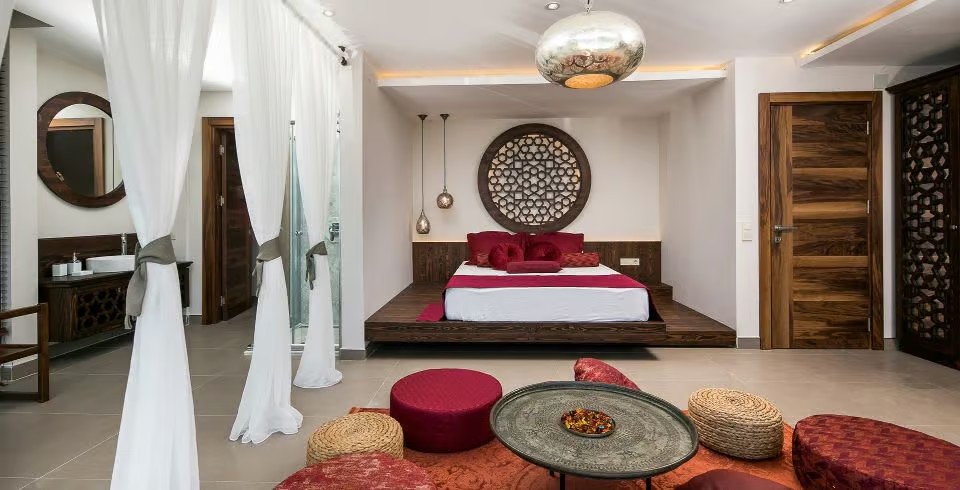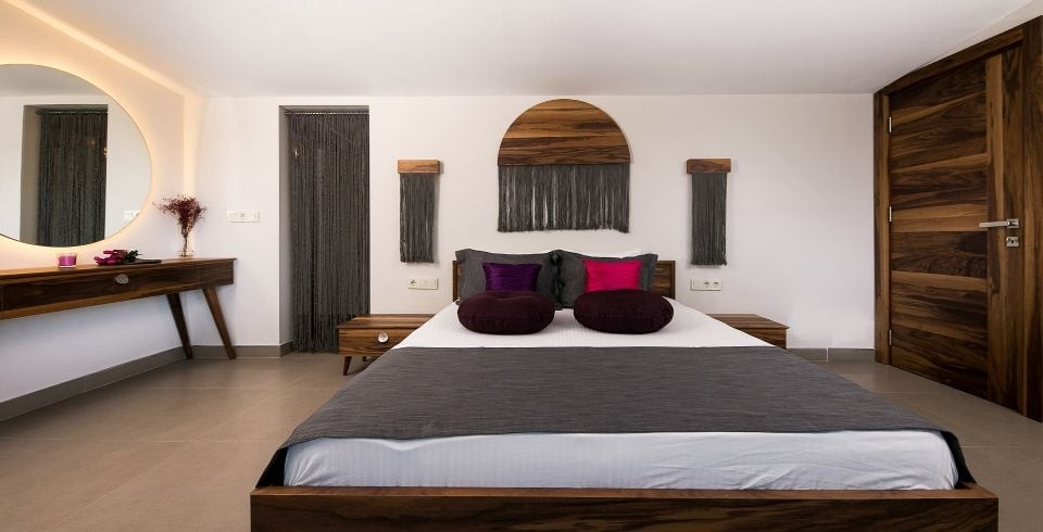 1. Yatak Odası :  Süit yatak odası çift kişilik konfor yatak, klima, gardırop, komodin, LCD TV ve banyo-WC ve havuz terasına çıkış yer almaktadır.
