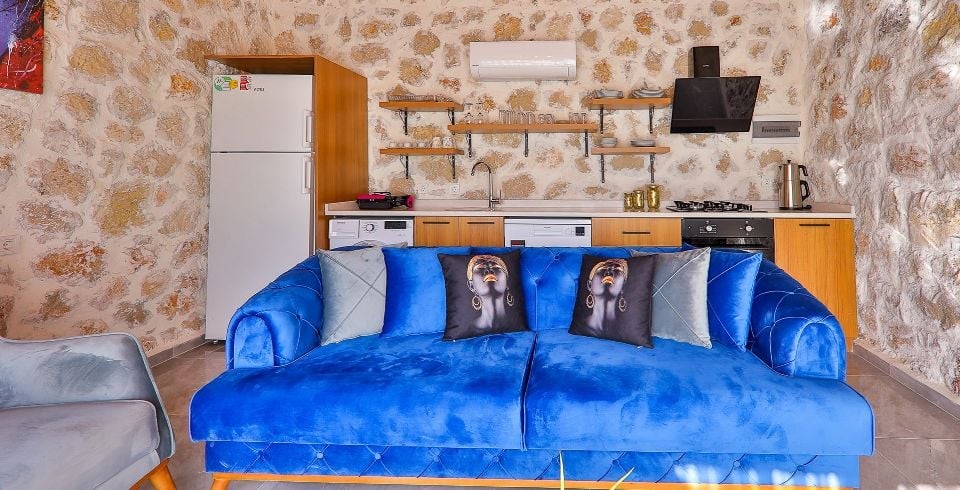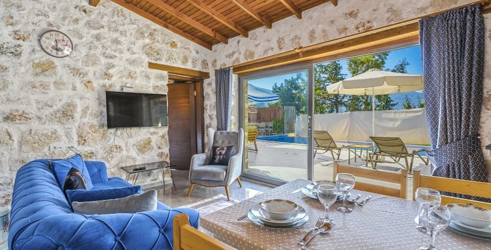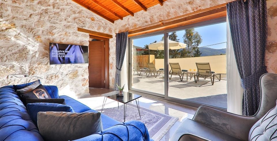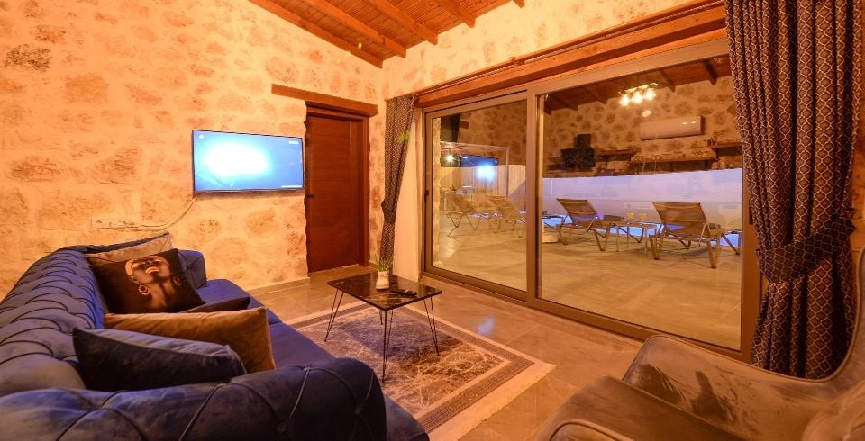 Salon : Villa Lavanya'nın salonunda sizi şık bir oturma grubu ile klima, TV, internet, uydu, koltuk, sehpa ile ferah bir salon bekliyor olacaktır. Havuz terasına çıkış yapılmaktadır.