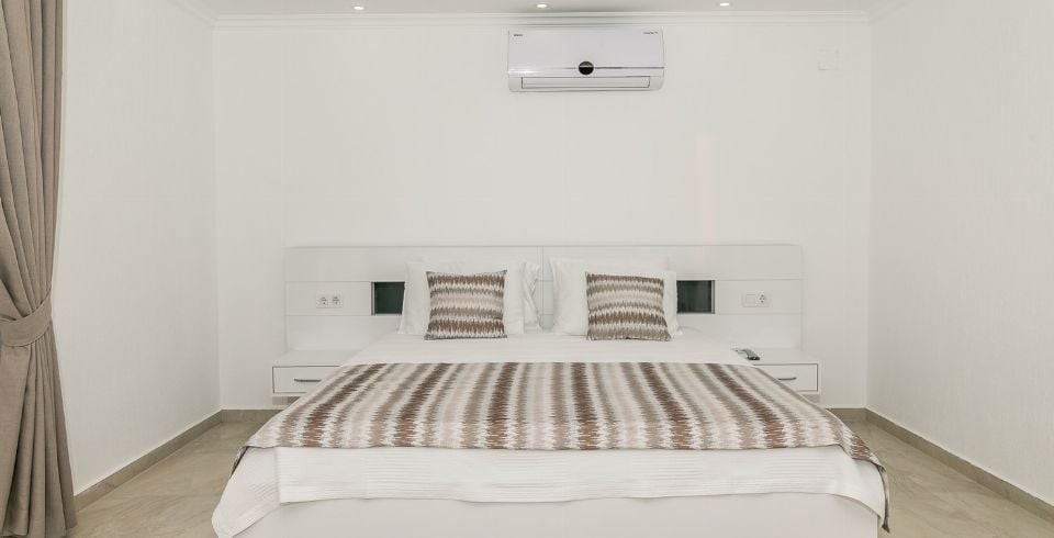 Villamız 2 yatak odası ve 4 kişilik konaklama kapasitesi ile çiftler ve çekirdek aileler için idealdir. Ahşap ve taş detayların modern dokunuşlarla harmanlandığı iç mekân, sıcak bir ambiyans sunar. Salon kısmında konforlu oturma grubu, televizyon, klima ve geniş cam kapılardan havuz terasına geçiş imkânı bulunur. Tam donanımlı Amerikan mutfakta; buzdolabı, bulaşık makinesi, çamaşır makinesi, fırın, ocak, kettle, tost makinesi, yemek takımı ve tüm mutfak gereçleri yer almaktadır.
