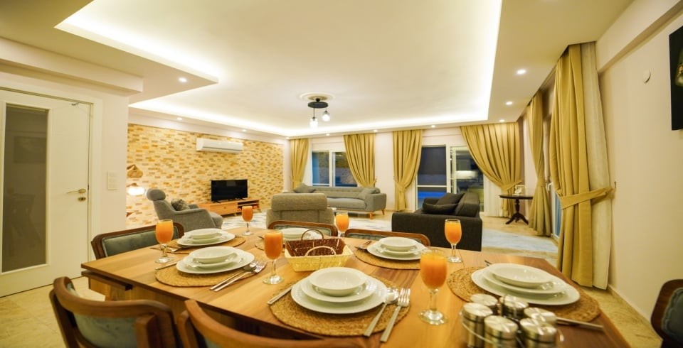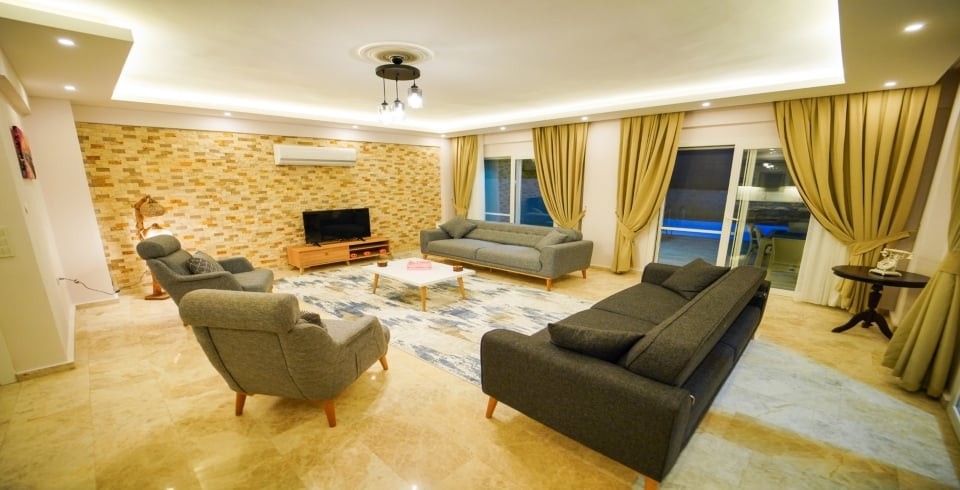 Salon: Villa salonunda konforlu oturma grubu, klima, TV, internet, uydu alıcı, yemek masası, sehpa bulunmaktadır.