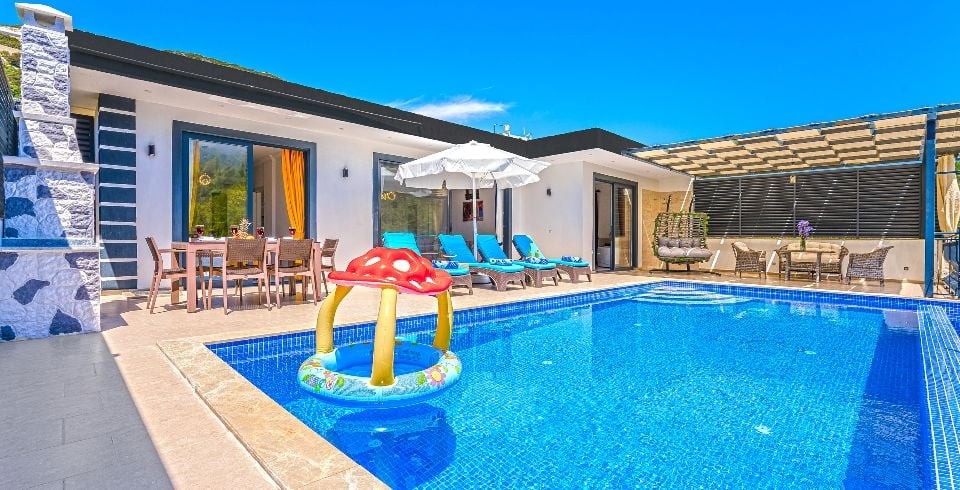 Havuz : Havuz terası korunaklı olup dış taraftan gözükmemektedir. Villamızın havuz terasında şezlong, şemsiye, mangal ve oturma grubu bulunmaktadır. (havuzdaki oyuncaklar görsel amaçlı bulunmaktadır.)