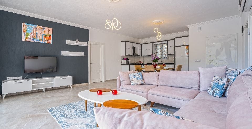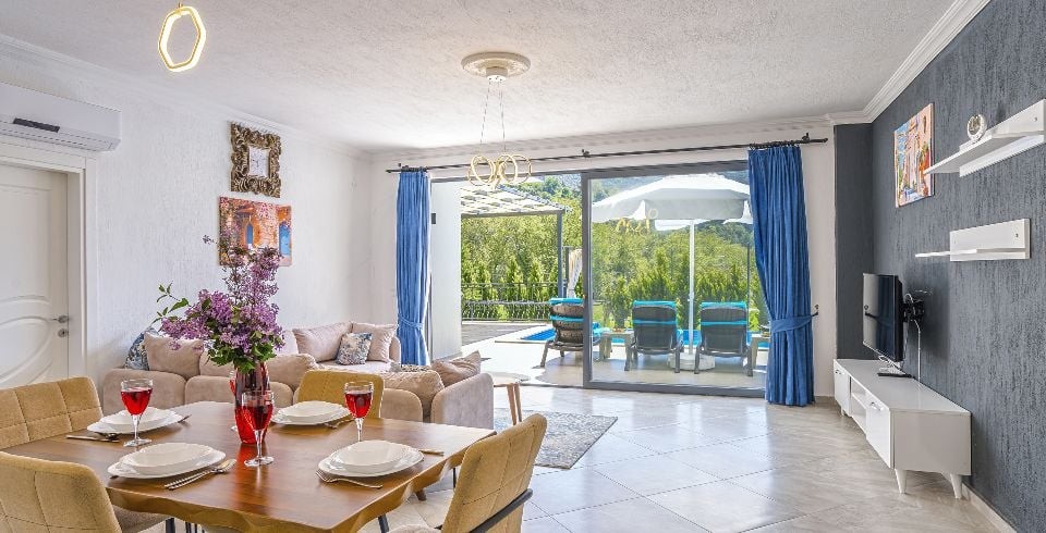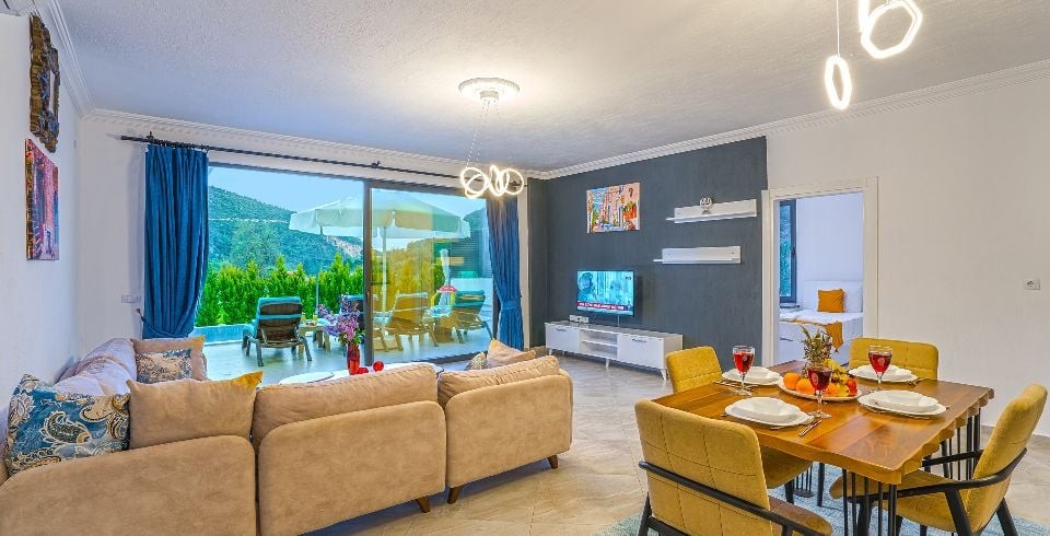 Salon : Salonumuzda oturma grubu, LCD TV, klima, sehpa bulunmaktadır. Havuz terasına çıkış yapılabilmektedir.