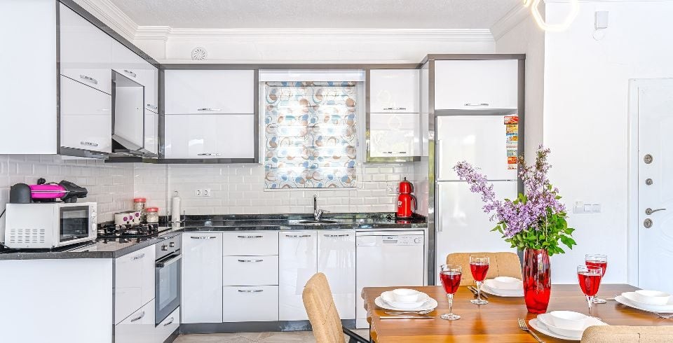 Mutfak : Modern Amerikan mutfakta buz dolabı, bulaşık makinası, 4'lü ocak, fırın, mikrodalga fırın, ekmek kızartma makinası, kettle, 4 kişilik yemek masası, yemek takımları, çatal ve bıçak takımları, tencere ve tava takımları, bardaklar bulunmaktadır.
