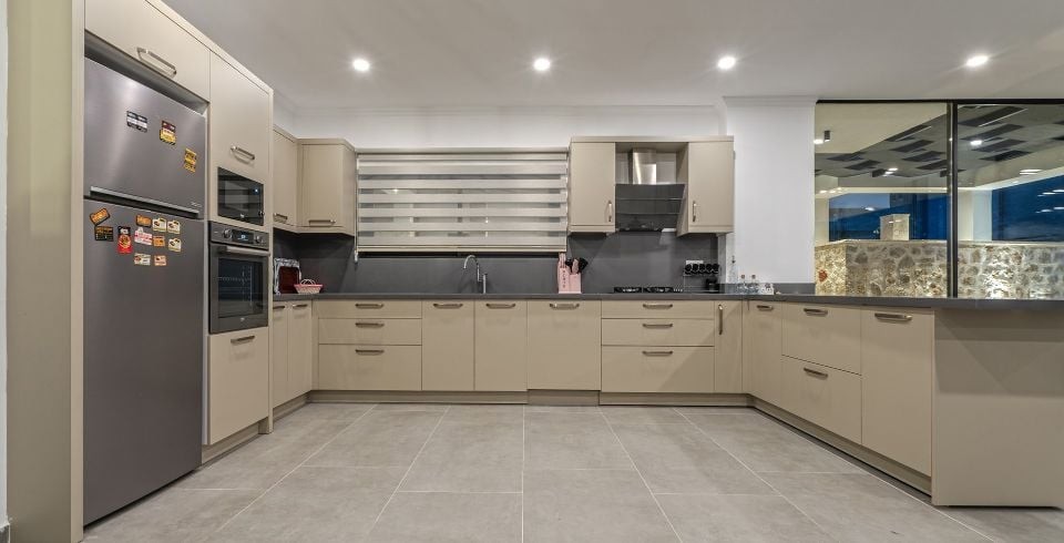 Mutfak : Modern Amerikan mutfak içerisinde  yemek masası, mama sandalyesi, buzdolabı, bulaşık makinası, fırın, ocak, mikrodalga fırın, tost makinası, yemek masası, yemek takımları, çatal ve bıçak takımları, tencere ve tava takımları, bardaklar bulunmaktadır.