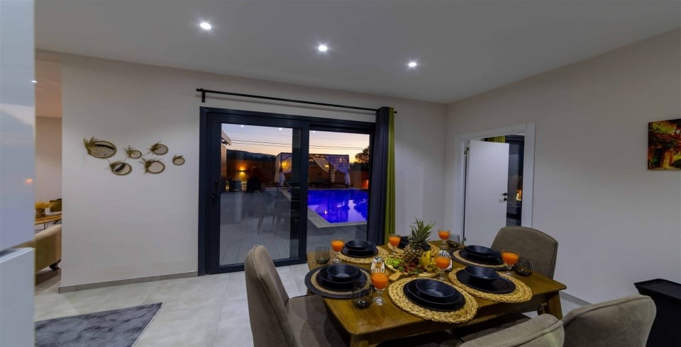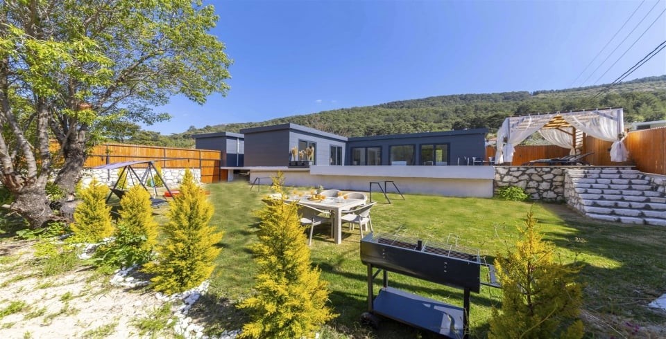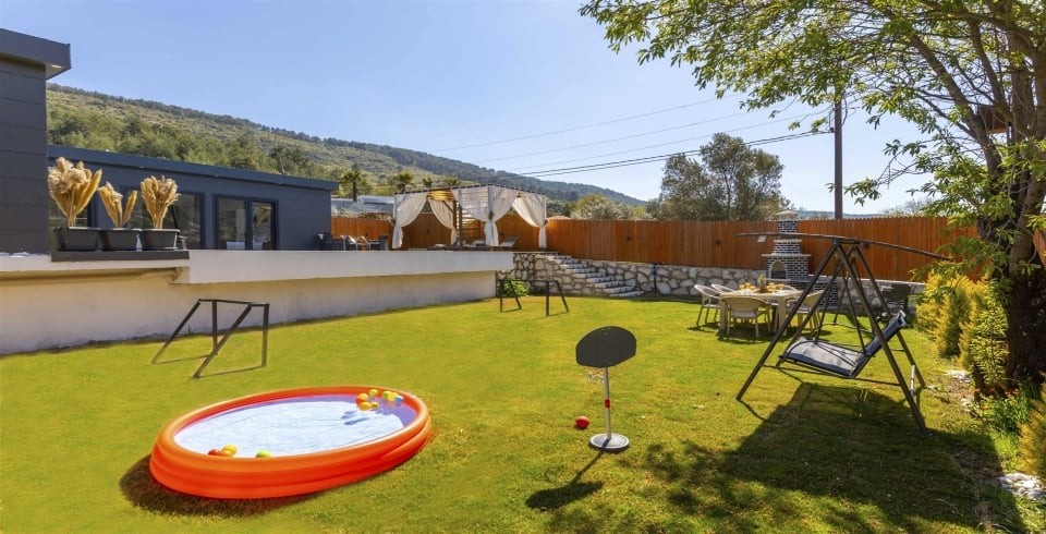 Villanın dış alanı, misafirlerin keyifli vakit geçirebileceği şekilde geniş ve yemyeşil bir bahçeyle çevrilidir. Korunaklı özel havuz, güneşlenme alanı, salıncak ve barbekü köşesi sayesinde ailecek huzurlu anlar yaşanabilir. Çocuklar için ayrılmış oyun alanı ise villayı aileler açısından daha da avantajlı kılar.