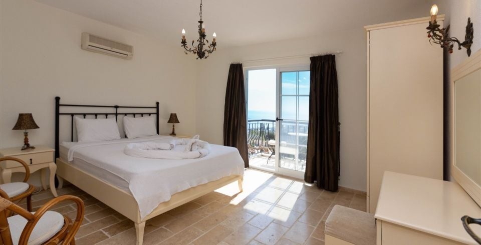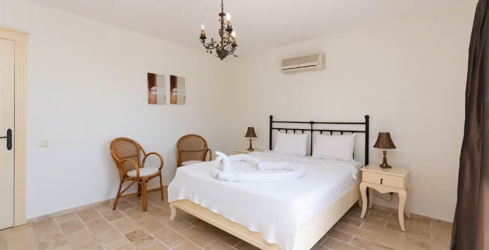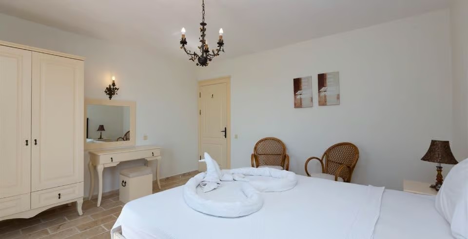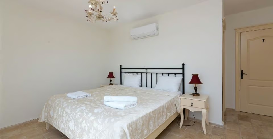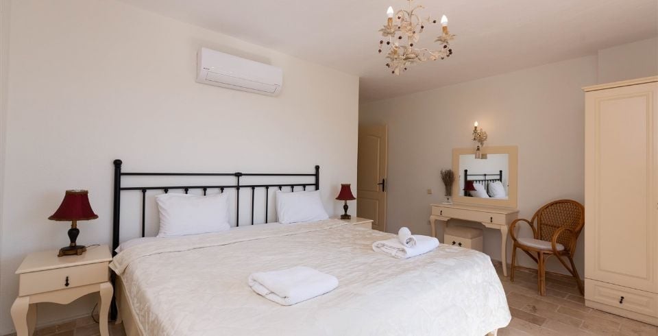 1. Yatak Odası : 1 adet süit çift kişilik yatak, klima, komodin, elbise dolabı, makyaj masası, banyo ve lavabo bulunmaktadır.