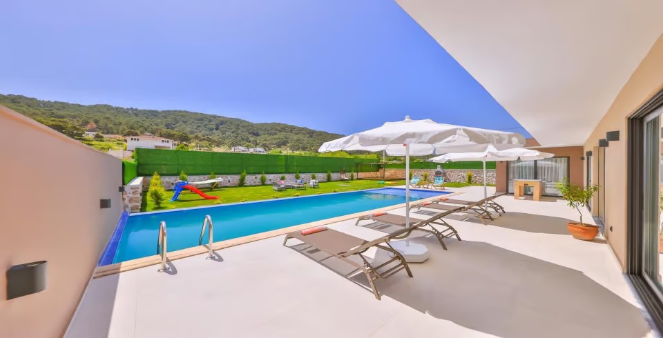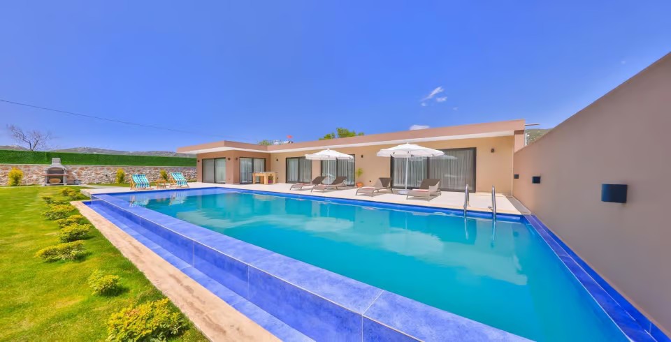 Havuz ve Bahçe : Özel yüzme havuzu bulunan villamızın havuz terasında şemsiye, şezlong, barbekü, oturma alanı, yemek masası ve sandalyeler bulunmaktadır.