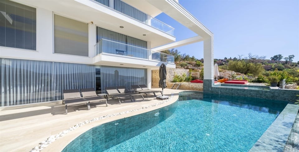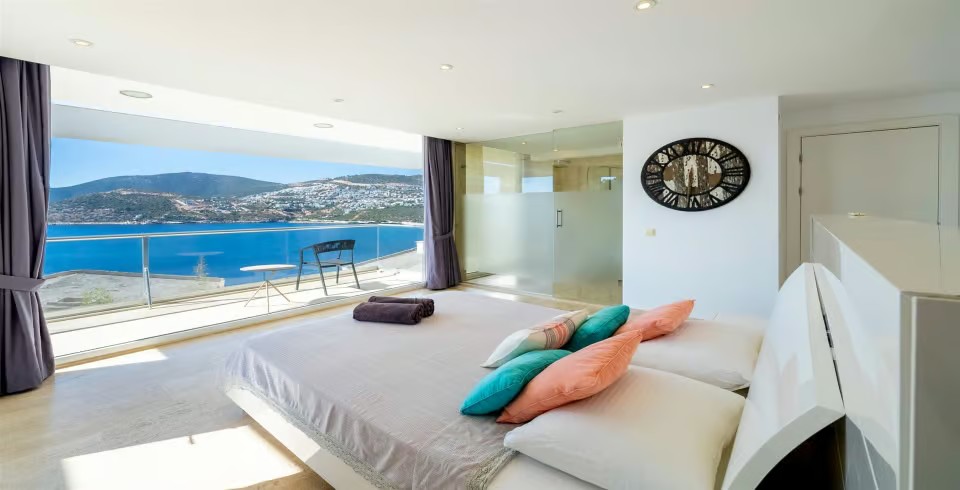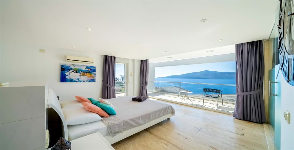 Villamız, toplam 6 adet ebeveyn banyolu yatak odasına sahip olup, geniş aileler ve kalabalık arkadaş grupları için 12 kişiye kadar konaklama kapasitesi sunar. Göz alıcı manzaraya sahip olan her katta balkon ve oturma alanları yer alır. En üst katta bulunan jakuzili süit oda, Kalkan koyunun panoramik manzarasını ayaklarınızın altına serer.
