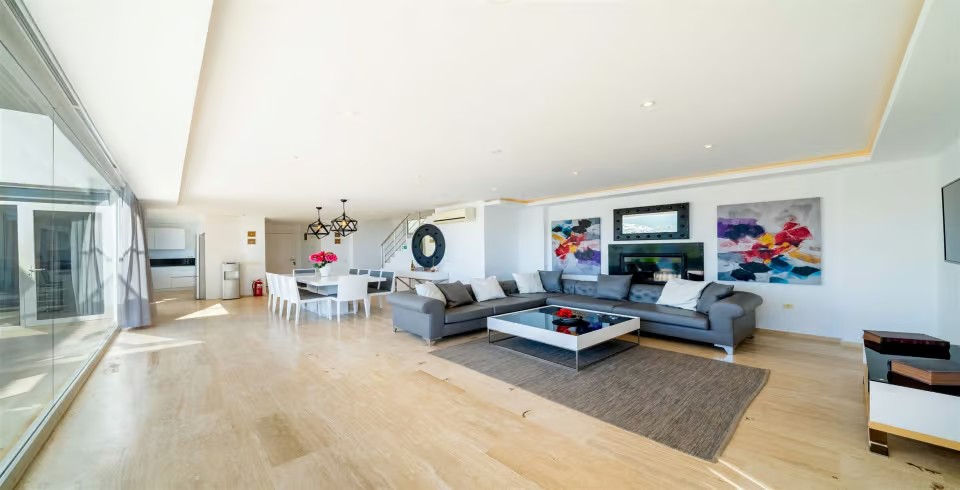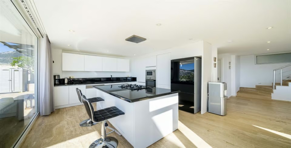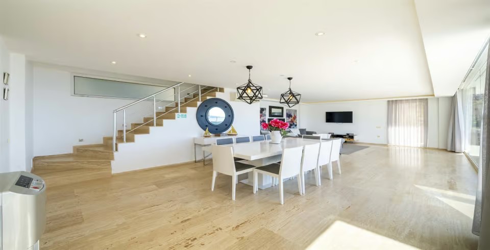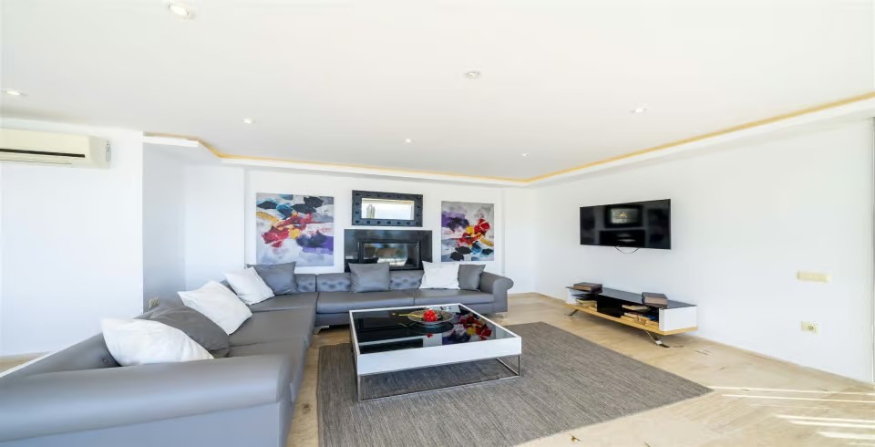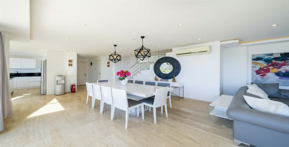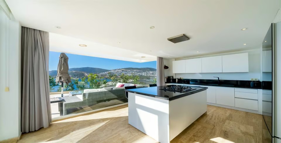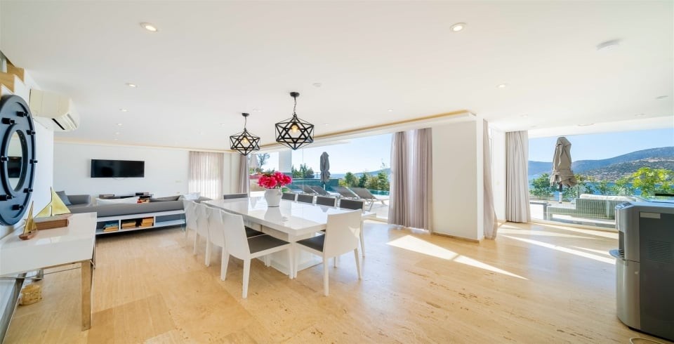 İç mekân, ferah ve aydınlık bir atmosfer yaratmak amacıyla yerden tavana kadar camlarla çevrilmiştir. Modern oturma grubunun yer aldığı geniş salon, deniz manzarasına hâkimdir. Tam donanımlı açık mutfakta; buzdolabı, bulaşık makinesi, fırın, mikrodalga, kahve makinesi, su sebili, elektrikli ocak, tost makinesi ve yemek takımı gibi ihtiyaç duyabileceğiniz tüm ekipmanlar mevcuttur. 10 kişilik yemek masası, kalabalık akşam yemekleri için ideal bir alan sunar.