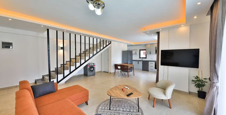 Salon: Villa salonunda konforlu oturma grubu, klima, TV, internet, uydu alıcı, yemek masası, sehpa bulunmaktadır.
