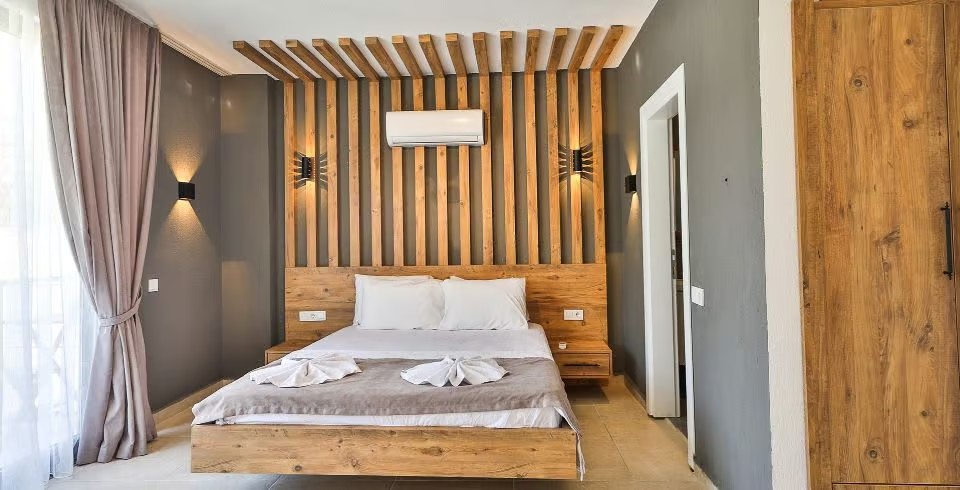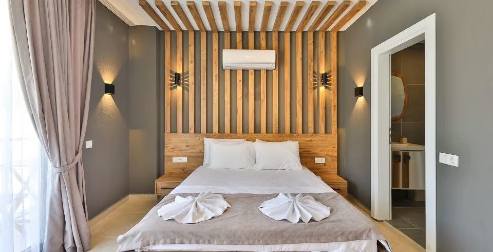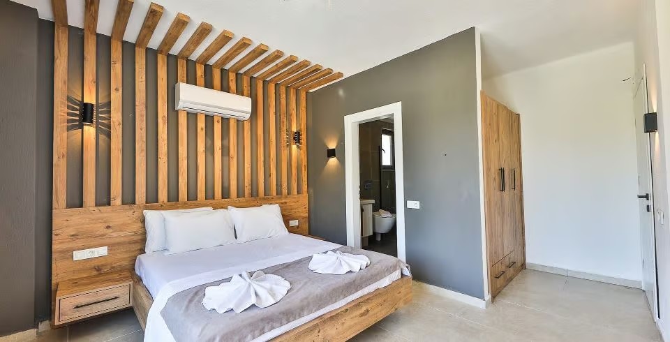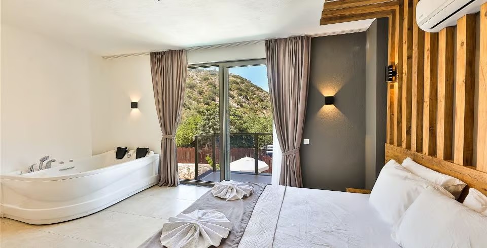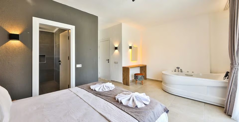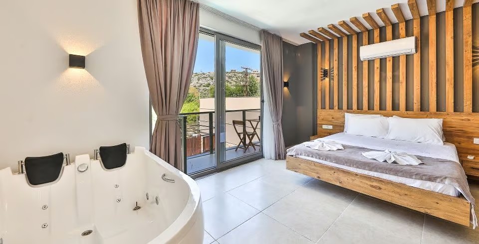 1. Yatak Odası: Çift kişilik yatak, klima, jakuzi, komodin, elbise dolabı, makyaj masası, banyo ve tuvalet bulunmaktadır.