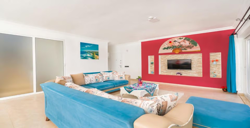 Salon : Villamızın iç dizaynı da son modaya uygun olarak modern bir şekilde tasarlanmıştır. Çeşitli dekoratif eşyalarla süslediğimiz salonumuz havuzlu bahçeye açılıyor. Villa salonunda oturma grubu, TV, internet, klima, sehpa bulunmaktadır.