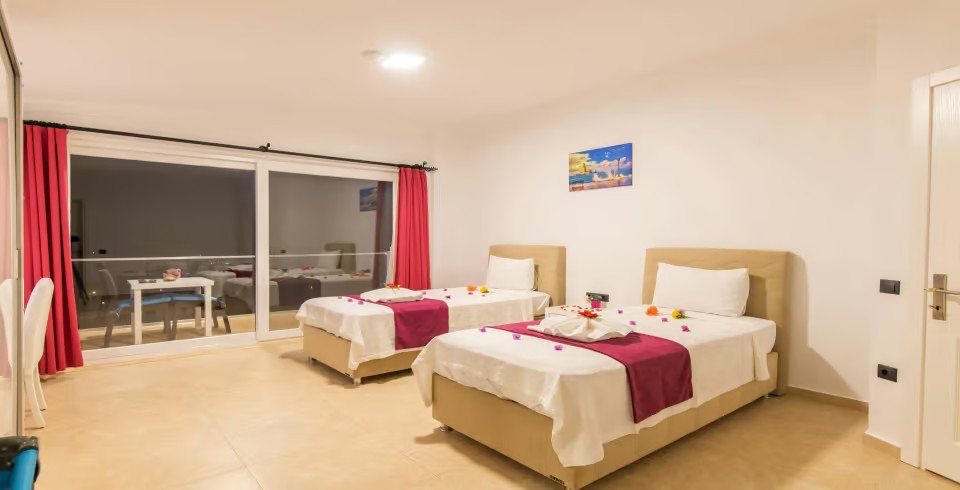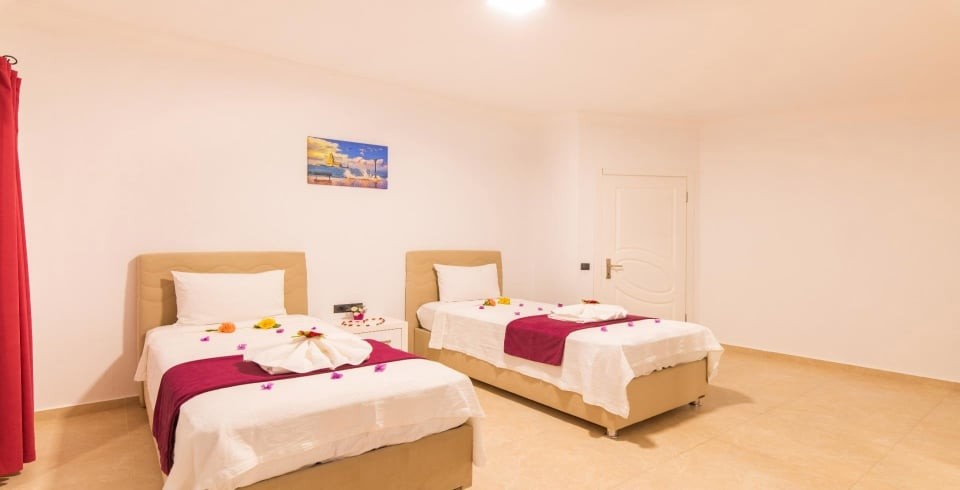2. Yatak Odası : 2 adet tek kişilik yatak, klima, komodin, elbise dolabı, banyo ve lavabo bulunmaktadır.