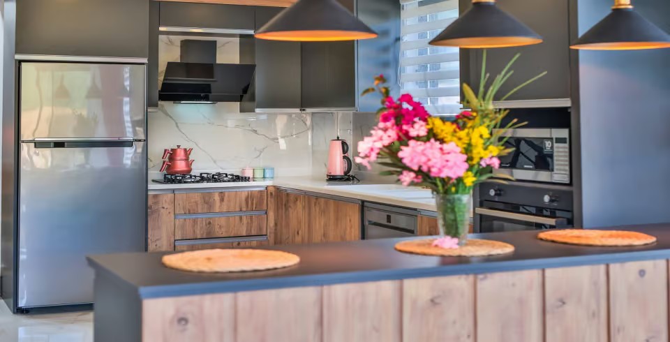Mutfak : Modern Amerikan mutfağında ;buzdolabı, bulaşık makinesi, fırın, mikrodalga fırın,4’lü ankastre ocak ,elektrikli su ısıtıcısı(kettle), yemek takımı , çatal bıçak seti , tavalar , tencereler , bardaklar bulunmaktadır.
