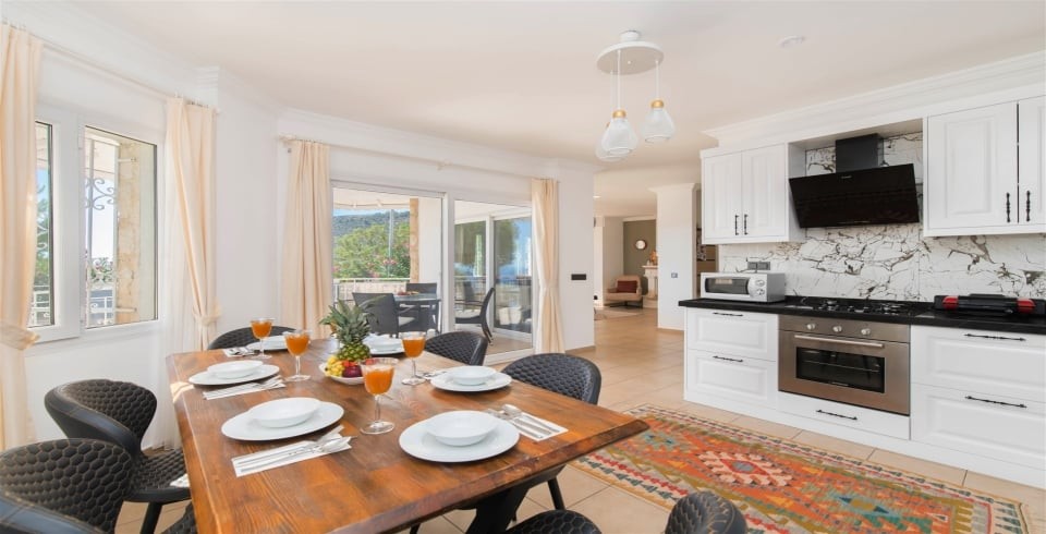 Mutfak : Yemek masası, buzdolabı, çamaşır makinesi, bulaşık makinası, mikrodalga fırın, 4’lü ocak, tost makinesi, elektrikli su ısıtıcısı, çatal-bıçak takımı, tencere-tava takımı, bulaşık makinesi bulunmaktadır.