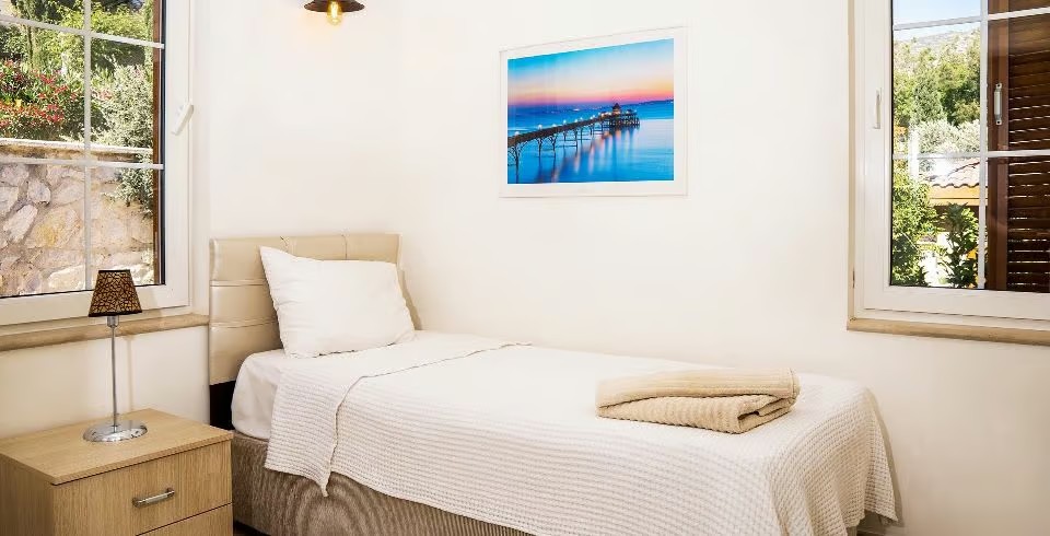 2. Yatak Odası :  2 adet tek kişilik yatak, klima, komodin, elbise dolabı, makyaj masası, banyo ve tuvalet bulunmaktadır.