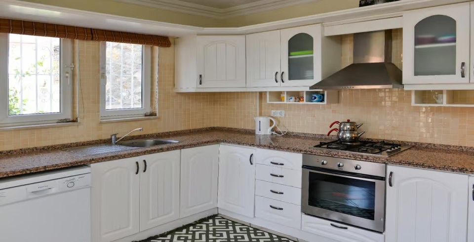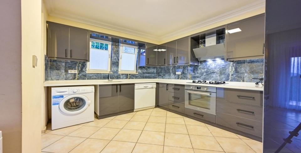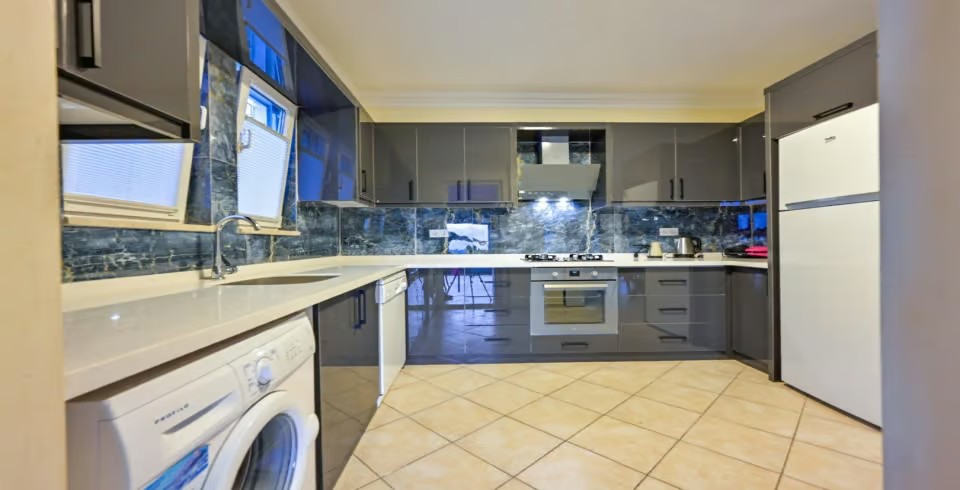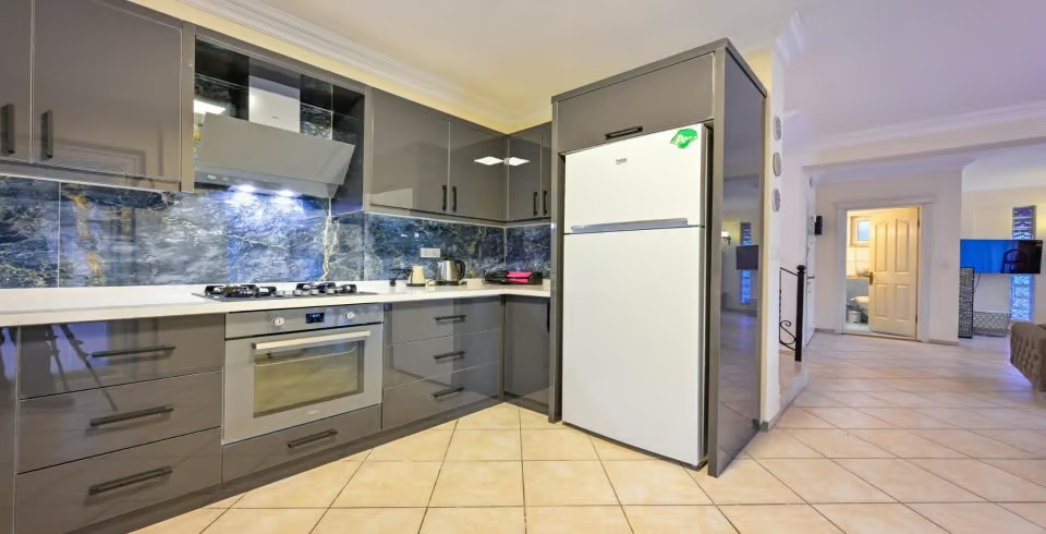 Mutfak : Amerikan mutfak, bulaşık makinası, buzdolabı, ankastre fırın, mikrodalga fırın, ankastre 4'lü ocak, su ısıtıcısı, yemek takımı, kaşık çatal bıçak takımı, bardak takımı, yemek masası ve sandalyeler.