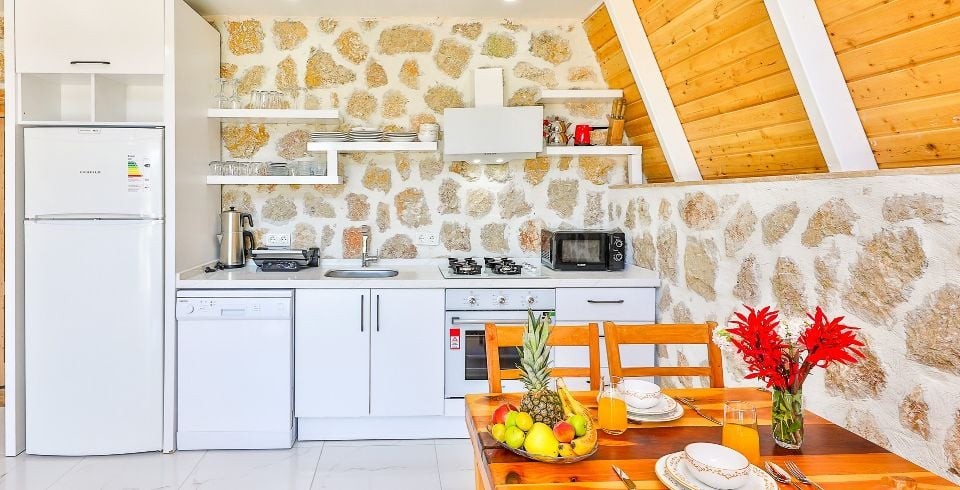 Mutfak: Villamızın mutfağında buzdolabı bulaşık makinası, çamaşır makinası, 4'lü ocak, ketıl, mikro dalga fırın, filtre kahve makinası yemek takımı bulunmaktadır.