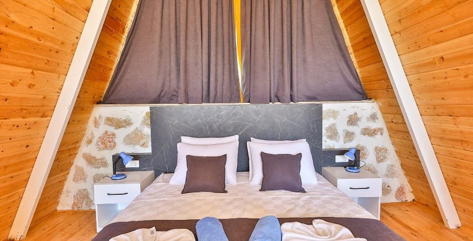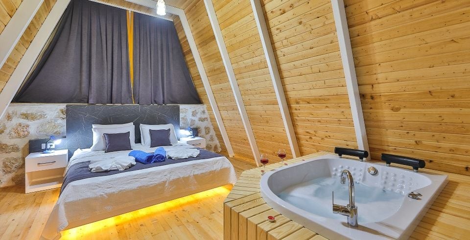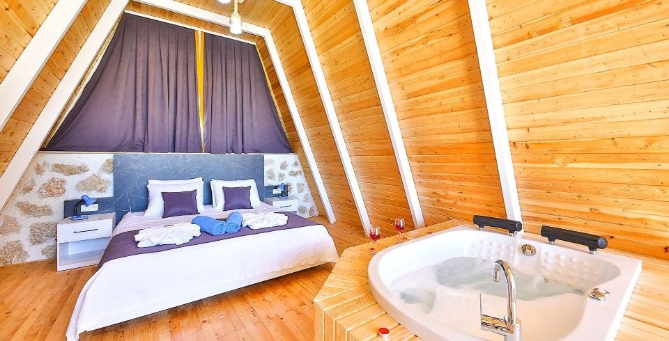 1. Yatak Odası: Çift kişilik yatak, klima, jakuzi, komodin, elbise dolabı, makyaj masası, banyo ve tuvalet bulunmaktadır.