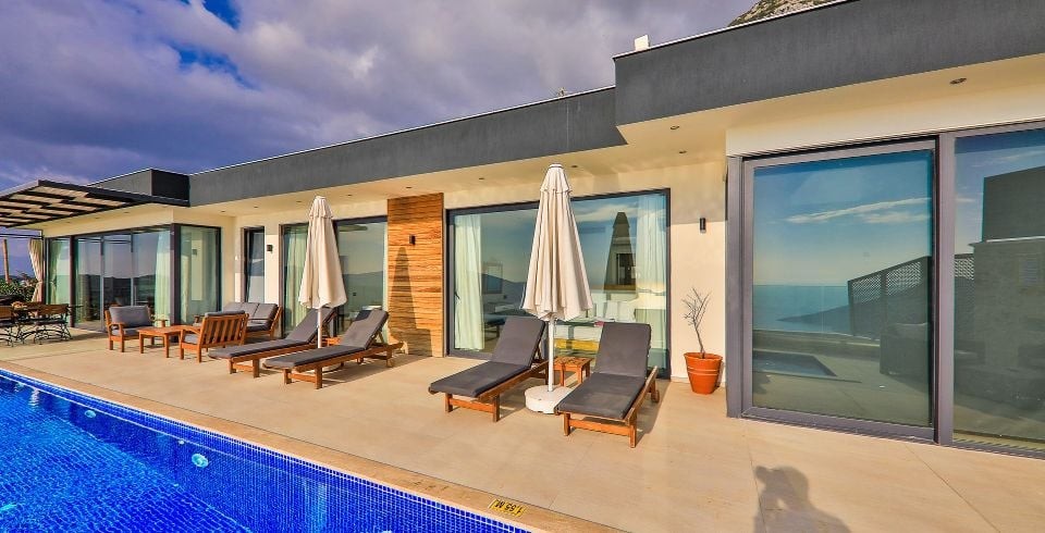 Havuz ve Bahçe : Villamızın özel sonsuzluk yüzme havuzu bulunmakta olup havuz başında, şemsiye, şezlong, barbekü, yemek masası bulunmaktadır.
